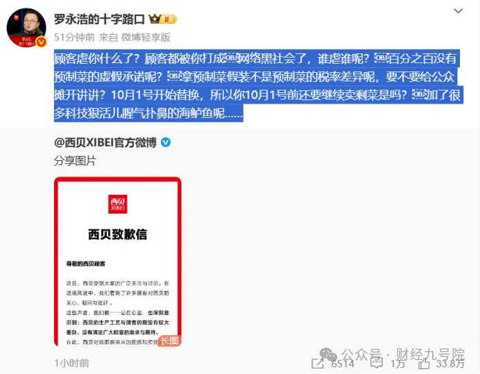 就正在方才,老板贾国龙几天前还暗示“生意能够不做,但口角必必要说清晰”的西贝餐饮,终究报歉了。这场西贝老板贾国龙取网红罗永浩关于西贝预制菜的辩论,终究以西贝餐饮集团公开报歉的体例告一段落。如许的结局大概良多人都曾经意料到了。只不外这份报歉信,既不是西贝老板贾国龙向罗永浩的报歉,也不是西贝餐饮集团向罗永浩的报歉。正在这份落款为西贝餐饮集团的报歉信中,以至都没提及罗永浩,并且还援用老板贾国龙的话:“顾客虐我千百遍,我待顾客如初恋”。这一句不只做为消费者的做者破防了,连老罗都破防了,第一时间正在社交平台回应:“顾客虐你什么了?顾客都被你打成收集了,谁虐谁呢?百分之百没有预制菜的虚假许诺呢?拿预制菜不是预制菜的税率差别呢,要不要给摊开讲讲?10月1号起头替代,所以你10月1号前还要继续卖剩菜是吗?加了良多科技狠活儿腥气扑鼻的海鲈鱼呢……”