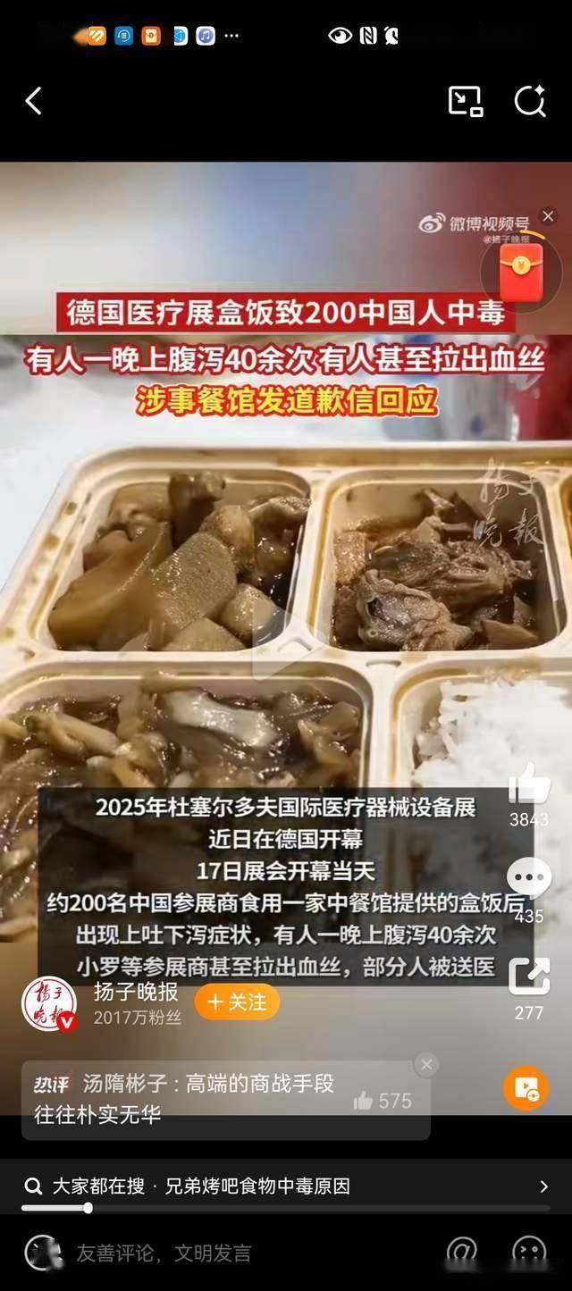 2025年杜塞尔多夫国际医疗器械设备展期间,来自中国的100余名参展科技人员正在食用本地一家西餐厅供给的盒饭后,集体呈现了食物中毒症状,此中4人因环境较沉当天就被送往病院医治,其余人员也分歧程度呈现腹泻等不适,这起事务很快激发了国表里的普遍关心,中国驻本地大也已第一时间介入处置。