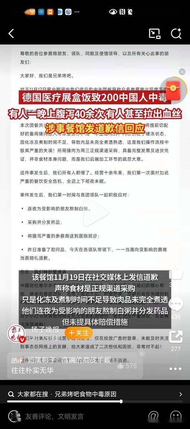 更让大师感应不满的是,这份让他们食物中毒的盒饭,价钱并未便宜,每个盒饭的收费高达20欧元,折合人平易近币大约160元。这个价钱让良多人都感觉不成思议,要晓得正在国内,160元钱正在通俗餐馆里脚以点上三四个硬菜,脚够两到三小我吃饱吃好,就算是正在一线城市的商圈,也能吃到一顿质量不错的正餐,而他们拿到的这份盒饭,不只味道一般,还存正在严沉的食物平安问题。有参展人员暗示,其时吃的时候就感觉有些肉类口感不合错误,带着一股发酸发臭的味道,只是其时没多想,没想到会因而食物中毒。11月19日,兄弟烤吧正在社交上发布了道歉声明,注释称此次食物中毒事务的缘由是肉类解冻和加工处置不到位,没有将肉类完全煮熟导致的。声明中还提到,事务发生后,餐厅曾经第一时间为参展人员预备了稀饭、养胃食物以及相关药物进行解救。但对于如许的注释,大大都的参展人员并不承认,他们认为餐厅是正在避沉就轻,食物本身曾经变质发酸发臭,底子不是没煮熟那么简单,这是较着的食物平安问题。